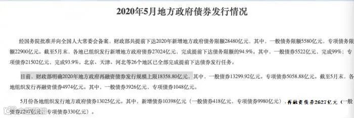 5月下旬全国“两会”审议通过的预算报告显示,今年全年新增地方债额度为4.73万亿,其中新增一般债0.98万亿,新增专项债3.75万亿。加上此次确定的再融资债券额度,今年地方债发行额度达到6.57万亿。如果地方政府足额发行,今年发行规模将比2019年增加2.2万亿。