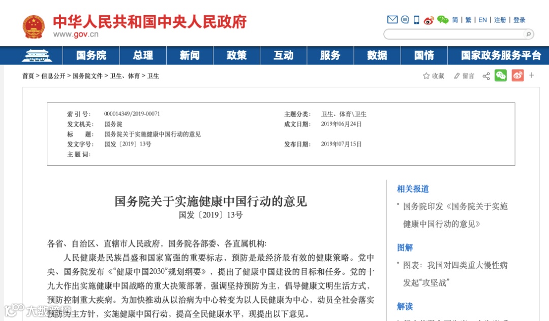 2019年7月,《国务院关于实施健康中国行动的意见》出台,健康中国行动推进委员会成立,相关部门出台了《健康中国行动组织实施和考核方案》。 这一系列举措,更是将健康产业的关注度推向新的高潮。