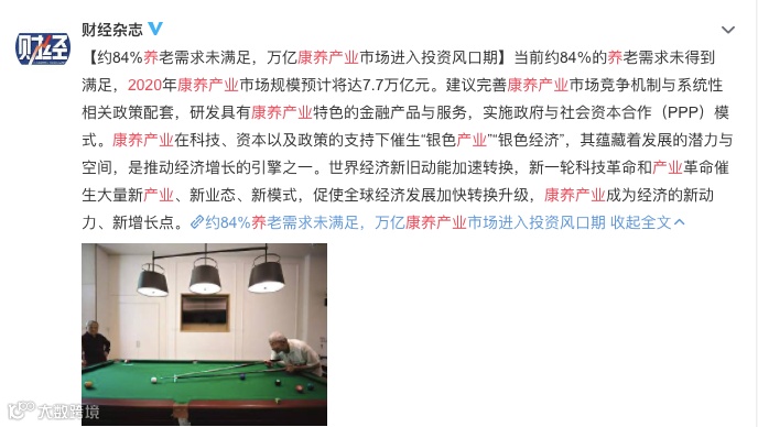日前,财经杂志发文称“当前约84%的养老需求未得到满足,2020年康养产业市场规模预计将达7.7万亿元”,从预计投资规模来看,“7.7万亿”实在让人震惊。到底是什么,给了市场7.7万亿的预期?这又与当前大众广泛关注的健康产业有着哪些关联呢?