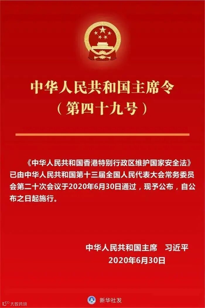 《中华人民共和国香港特别行政区维护国家安全法》已由中华人民共和国第十三届全国人民代表大会常务委员会第二十次会议于2020年6月30日通过,现予公布,自公布之日起施行。