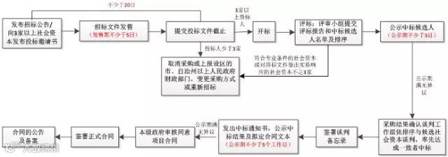 根据《招标投标法》、《招标投标法实施条例》、《政府采购法》、《政府采购法实施条例》、《政府采购货物和服务招标投标管理办法》、113号文和《PPP项目采购办法》等规定,通过公开招标及邀请招标方式采购PPP项目的流程如下: