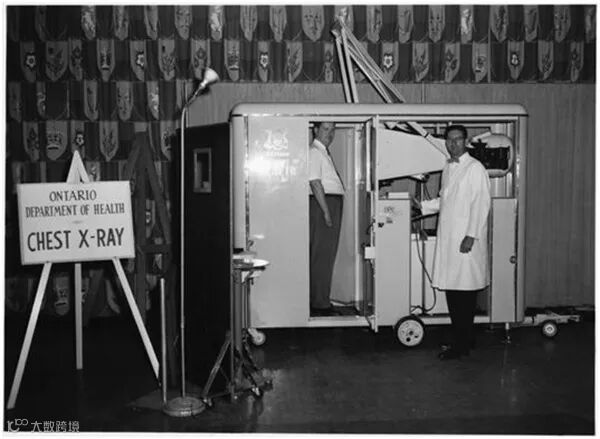 X射线技术和现代建筑大约同时诞生,并共同发展。如果说20世纪初期对玻璃的大量实验和应用只局限于前卫建筑师的小圈子中,那么到了20世纪中叶,通透的玻璃住宅已经广泛普及,正如为抗击结核病动员全民进行X射线拍摄的计划一样。移动X射线机出现在百货商店、工厂、学校和郊区街道等地方,并得到报纸文章、广播和电影的大力支持(图六)。与X射线一样,玻璃幕墙也是控制的工具(Instruments of control):X射线将人体内部暴露给公众,现代住宅也透过玻璃展示其内部的构造,以前不为人知的内容都可以被公众审阅。