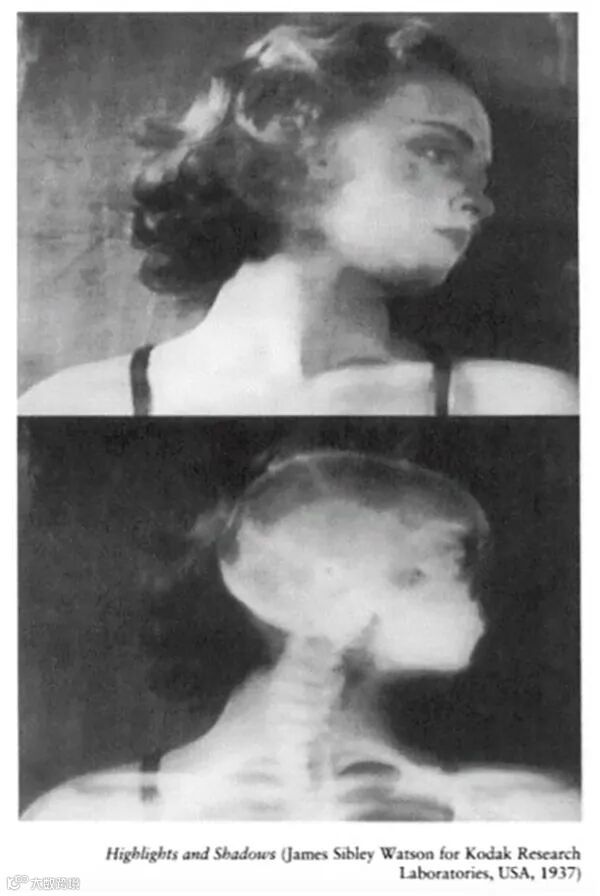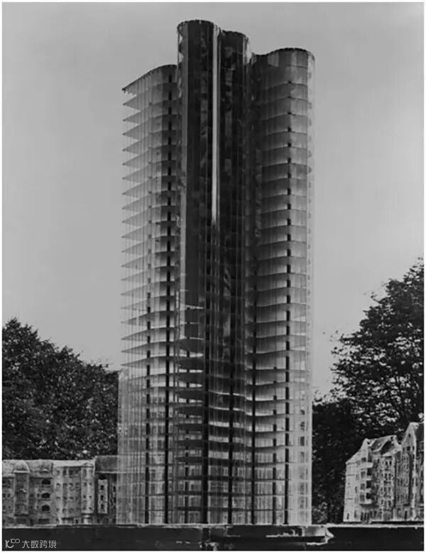 现代建筑甚至开始越来越像医学图像。X射线技术对许多20世纪初的前卫建筑师颇有影响。密斯将其设计称为“皮包骨”,将玻璃摩天楼的结构称为“骨骼”,其表现图也像通过X射线机看到的一样(图五)。密斯并不是个例,任何建筑档案馆都有大量同时代的透明玻璃表皮建筑,展示着建筑内部的“骨骼”和“器官”。现代建筑作品集像是胸腔X光片的合集。这不仅是主流审美,这更是源自医学的设计理念的症结。