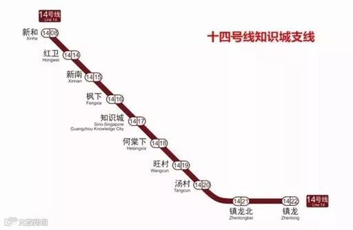 本次开通的知识城线为地铁14号线的支线,14号线主线长54.1公里,全程共13个站点:嘉禾望岗-东平-石湖-太和-竹料-钟落潭-黎家塘-新和-太平-神岗-邓村-江埔-街口。知识城支线从新和引出,经中新广州知识城至萝岗区镇龙镇。