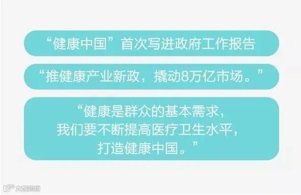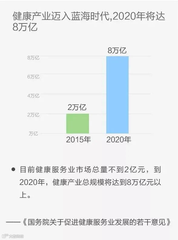 2016年10月,中共中央、国务院印发了《“健康中国2030”规划纲要》,提出到2020年,健康服务业总规模超过8万亿元,2030年达到16万亿元,这是我国首次在国家层面制定的健康领域中长期战略规划;