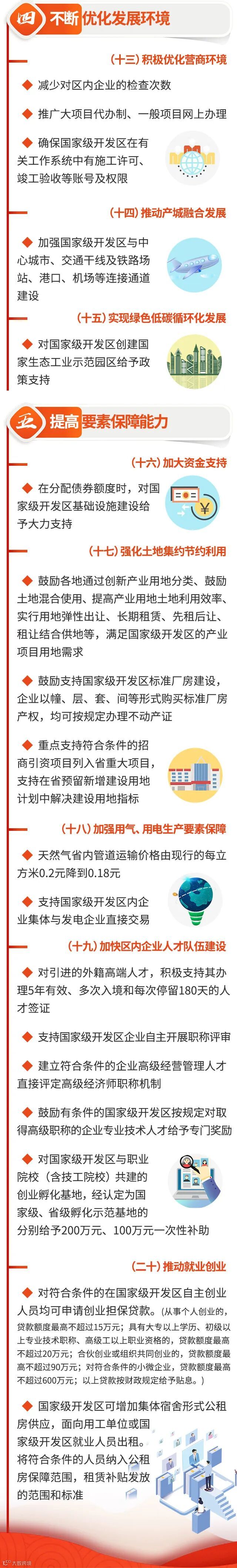 对符合条件的在国家级开发区自主创业人员均可申请创业担保贷款。从事个人创业的,贷款额度最高不超过15万元;具有大专以上学历、初级以上专业技术职称、高级工以上职业资格的,贷款额度最高不超过20万元;合伙创业或组织共同创业的,贷款额度最高不超过90万元;对符合条件的小微企业,贷款额度最高不超过600万元;以上贷款按财政规定给予贴息。国家级开发区可根据新就业无房职工和外来务工人员数量,在区内配套建设用地上,通过集中建设、配建等方式,增加集体宿舍形式公租房供应,面向用工单位或国家级开发区就业人员出租。将符合条件的人员纳入公租房保障范围,租赁补贴发放的范围和标准,由各地因地制宜确定。(责任单位:省人力资源社会保障厅、省财政厅、省住房城乡建设厅,有关设区市、县〔区〕人民政府)