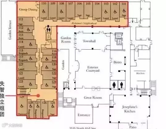 清晰、标准的三种养老模式:独立自主、辅助生活、失智特护。贝尔蒙特庄园拥有明确的客户定位,不同空间模式分别对应独立老人、介助老人、失智老人。