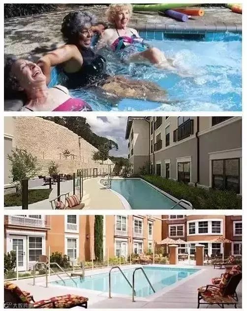 庄园中的游泳池分为室内、室外两种,泳池位置的布置主要根据庄园所处地的气候来决定,例如,加州由于常年气候温暖,阳光充沛,故而加州几家庄园的游泳池都设 置在室外。庄园的游泳池均为小型泳池,水深度较浅,泳池底部和周围地面均铺有防滑地材。泳池周围设有几把靠椅,以供老人休息时使用。