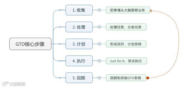 时间管理有很多种方法,而GTD(全称:Getting Things Done)就是其中一套行之有效的方法,也是现在最受欢迎的方法。Getting Things Done翻译成中文就是“把事情做完”,GTD的核心理念概括就是 “通过记录的方式把头脑中的各种事情移出来,然后整理安排自己去执行”。GTD的核心步骤为五步:收集、处理、管理、执行、回顾。