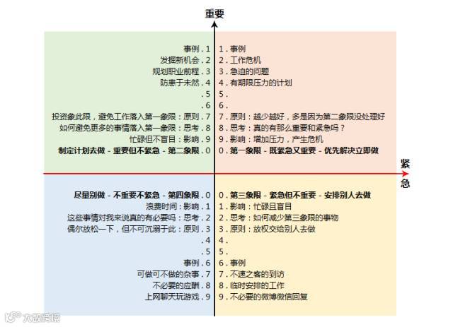 只有及时处理信息,对信息及时做出决定和归纳成类,你才能避免信息的堆积和碎片化,处理信息时采用二分钟法则和四象限法则,二分钟方法就是如果一件事情两分钟内能解决的事情,无论是何种事情,马上着手解决掉,如果不能再进行分类。分类则采用四象限法则,四象限法则是把工作按照重要和紧急两个不同的程度划分成四个“象限”:既紧急又重要、重要但不紧急、紧急但不重要、既不紧急也不重要
