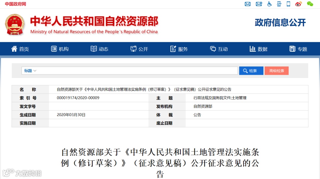 自然资源部关于《中华人民共和国土地管理法实施条例(修订草案)》(征求意见稿)公开征求意见的公告