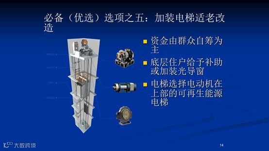 加装电梯的资金由群众分担为主,然后对底层住户应给予适当补偿,补偿底层居民的方式可以多种多样,但一定要公平合理,一视同仁。另外电梯的驱动电机应该安装在电梯顶部,这样就不用挖深坑,以免影响到管网的布局和防涝。针对不同的住宅楼,我们已经有了成熟的多样化方案。