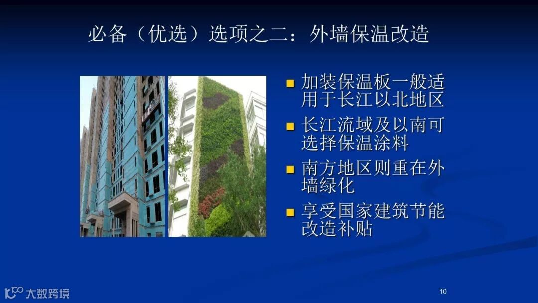 选用外墙保温材料需要因地制宜,例如北方地区住宅采用的较厚的防火保温板并不适用于南方地区。根据建筑节能标准,我国共有五个气候区,都应因地制宜选用合适的保温模式。对于北方地区的老旧小区而言,原来用的聚酯泡沫外墙保温板存在着消防安全隐患,有的甚至完全老化,一到雨天就直接泡水失去保温效能,这些都是急需进行更换改造的。而冬暖夏热地区只需在住宅外墙绿化或朝西南面种上乔木,以及给商户安装外遮阳就可显著提升节能保温效果。