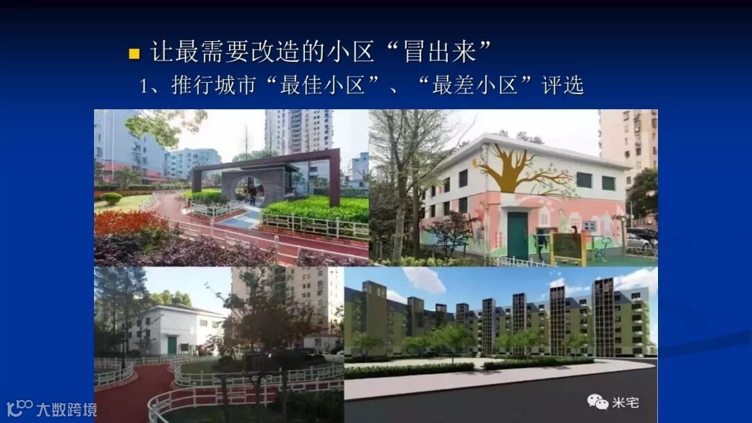 如何让最需要改造的小区它自己能够“冒出来”,倘若能让小区居民自发的提出“我要改造”,这事情就好办了。而且最好是能有一批这样的老旧小区居民竞争着向政府申请改造,但是这一批中政府应该支持哪些小区优先安排改造呢?首先则需要推行城市“最佳小区”和“最差居住小区”的评选活动,而且还可将居住在“最差小区”的居民邀请到“最佳小区”去参观体验,就可激发出他们改造老旧小区的积极性和参与性。如果我们的城市能评选出一批今年的“最差小区”,那么政府部门就能够准确把握老百姓的实际需求从而制定改造方案,等于说这件事情就成功了一半。这么一种“自发”的模式已经有很多城市都做过并且在持续改进之中。