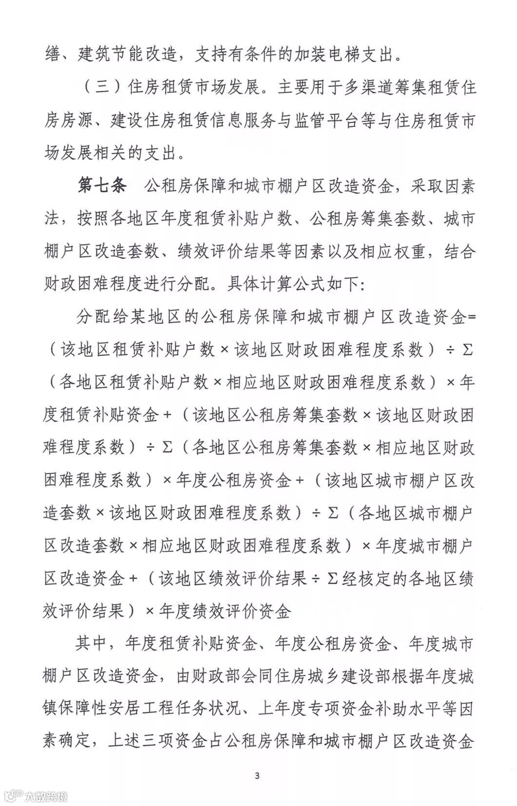 此次《办法》明确,对老旧小区改造资金采取因素法,按照各地区年度老旧小区改造面积、改造户数、改造楼栋数、改造小区个数和绩效评价结果等因素以及相应权重,结合财政困难程度进行分配。