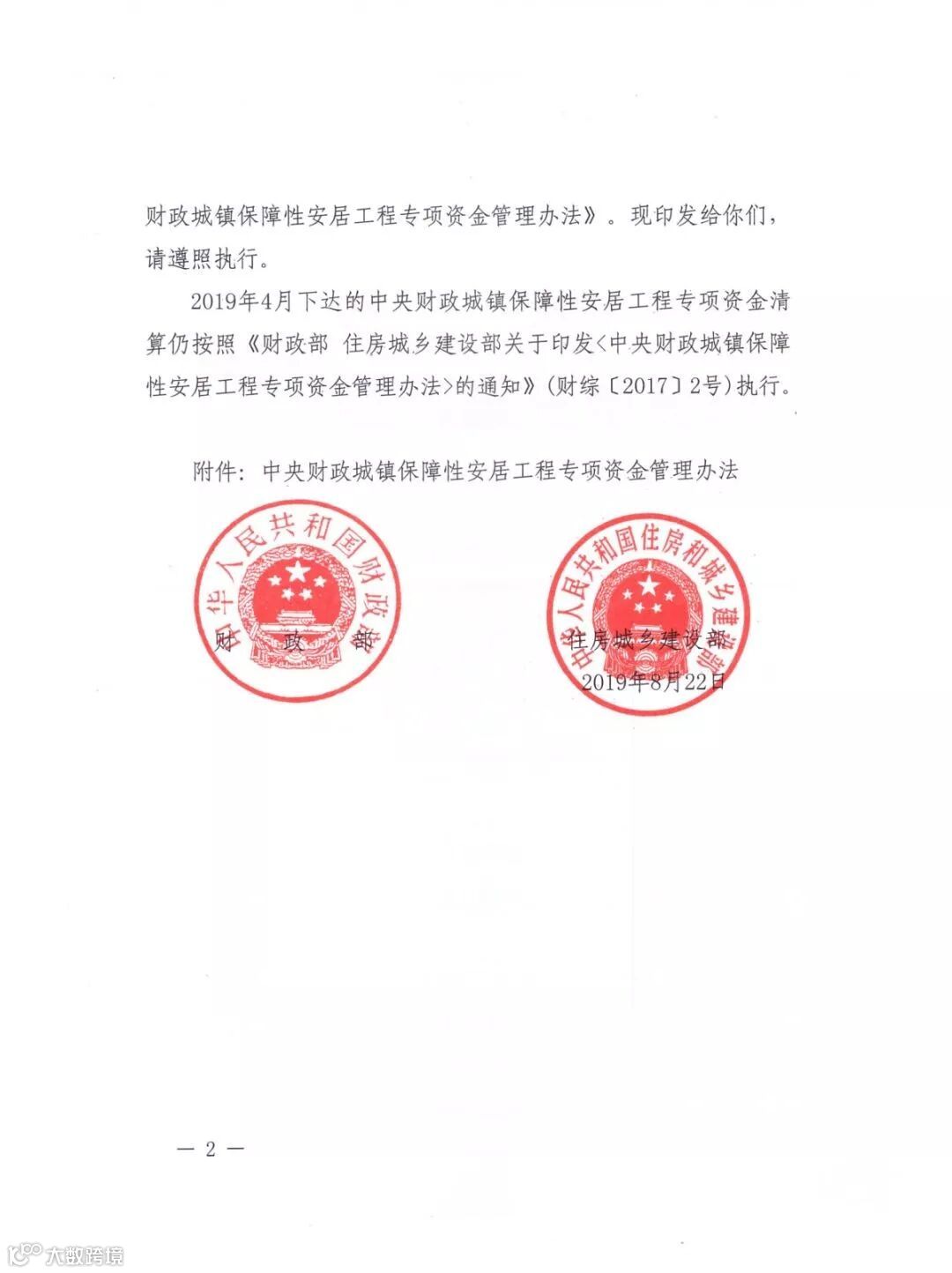 2019年4月下达的中央财政城镇保障性安居工程专项资金清算仍按照《财政部 住房城乡建设部关于印发<中央财政城镇保障性安居工程专项资金管理办法>的通知》(财综〔2017〕2号)执行。