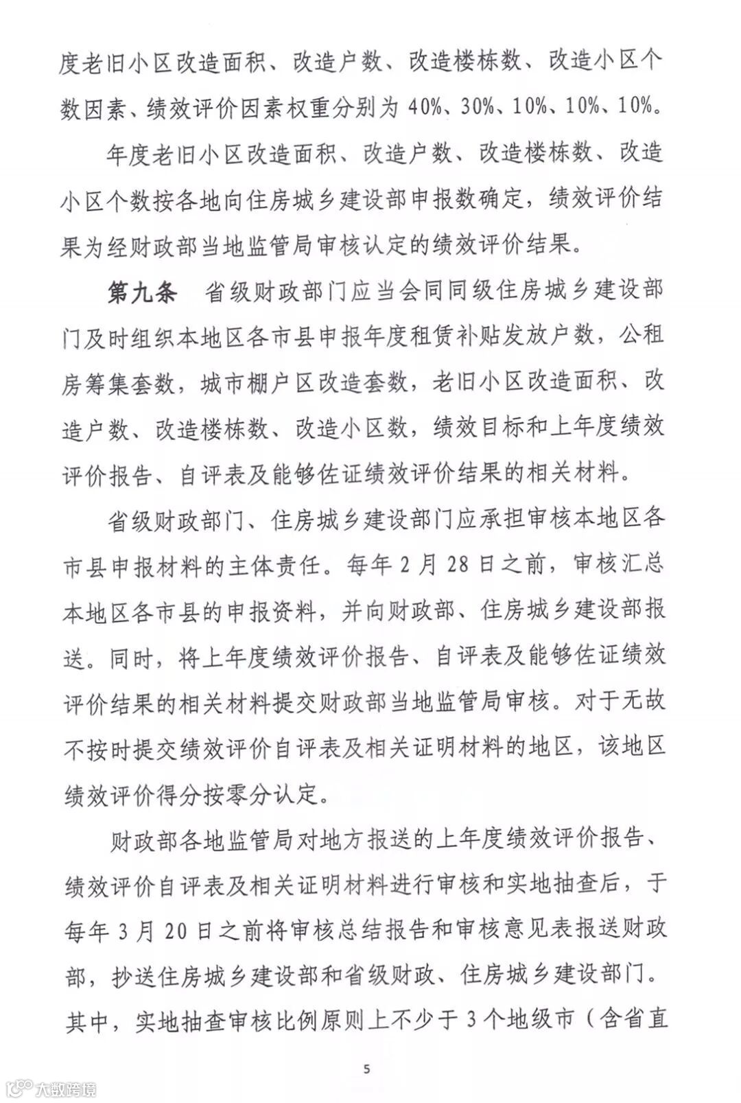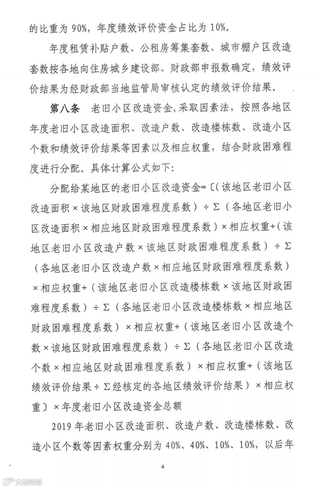 其中,2019年老旧小区改造面积、户数、楼栋数、小区个数等因素权重分别为40%、40%、10%、10%。以后年度老旧小区改造面积、户数、楼栋数、小区个数、绩效评价因素权重分别为40%、30%、10%、10%、10%。