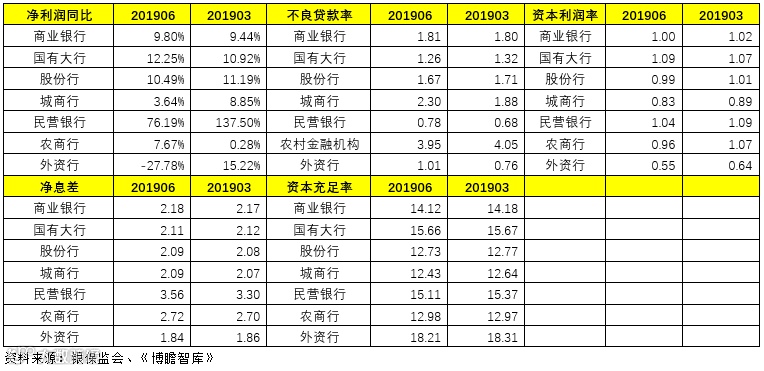 银保监会8月12日公布银行业2019年上半年经营情况。上半年净利润同比76.19%,位于所有类型银行中最高(基数较低),同时上半年不良贷款率为0.78%(所有银行中最低)但有所上升(仅城商行、民营银行处资行的不良率有所上升)。