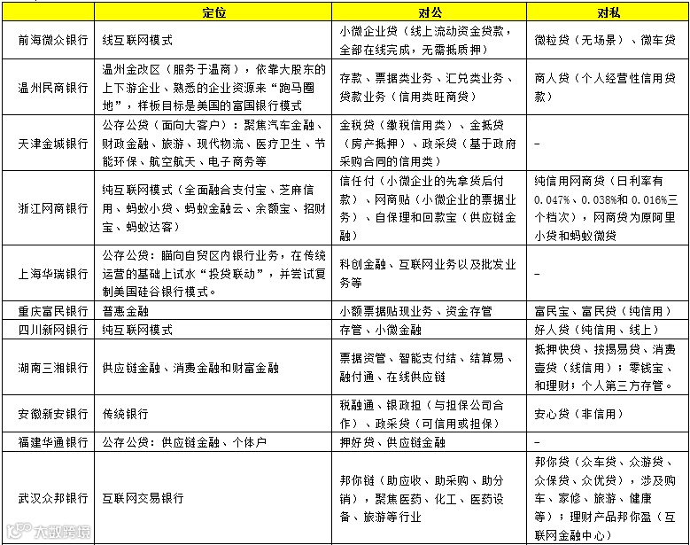 对于更多的民营银行而言,由于成立时间较晚,至今运营不过两年,谈及定位虽可以夸夸而谈,但涉及到具体的业务种类与模式则鲜有创新。这里仅筛选部分具有代表的民营银行以供参考。