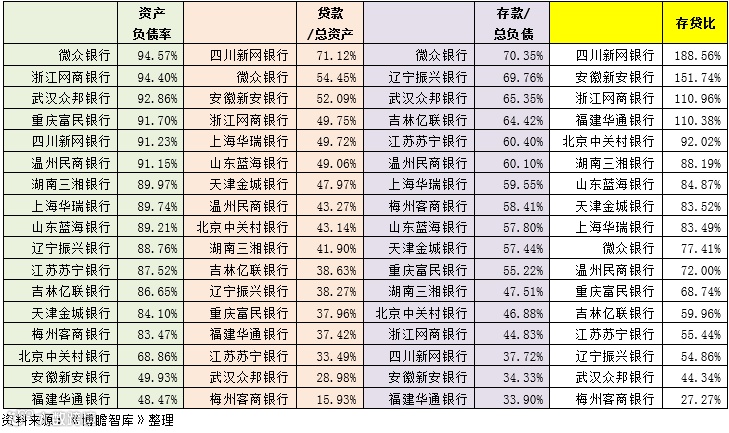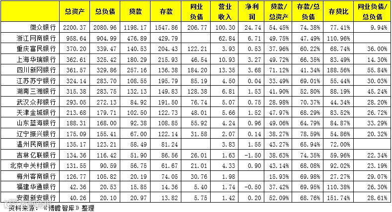 民营银行无论标榜什么什么愿景,其本质终究是银行,因此民营银行的资产负债率正常情况下应和普通银行保持一致,即93-95%的资产负债率。从17家银行公布的数据来看,仅微众银行、网商银行、众邦银行、富民银行、新网银行、民商银行基本符合这一特征,诸如北京中关村银行、安徽新安银行、福建华通银行的资产负债率甚至不足70%。