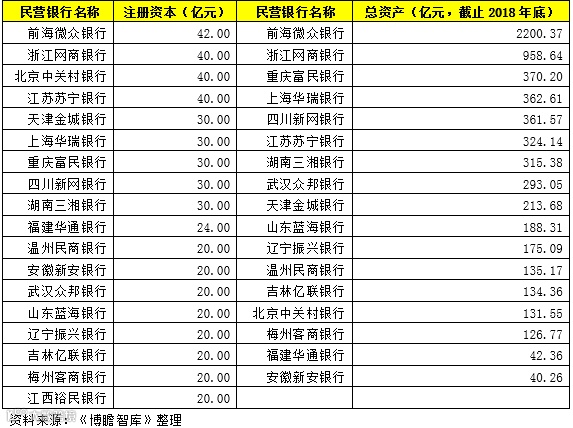 目前18家民营银行的注册资本合计为496亿元,参照城商行的起点,民营银行最低注册资本规模为20亿元。其中,注册资本在40亿元以上的民营银行有4家,分别为前海微众银行、浙江网商银行、北京中关村银行、江苏苏宁银行。