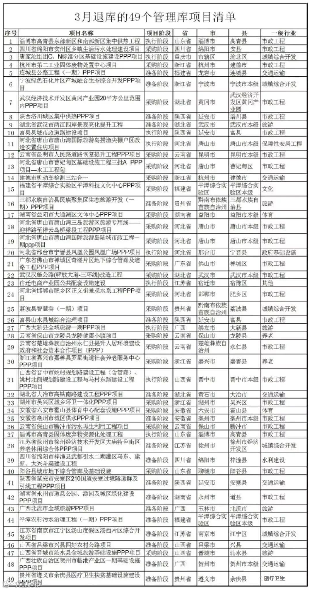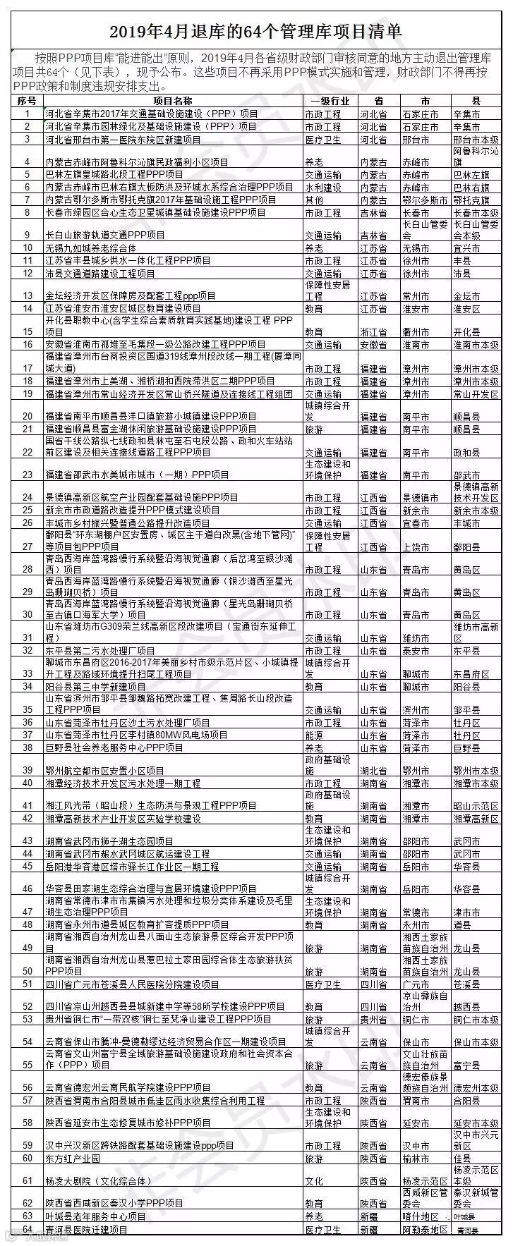 2019年4月各省级财政部门审核同意的地方主动退出管理库项目共64个(见下表),现予公布。这些项目不再采用PPP模式实施和管理,财政部门不得再按PPP政策和制度违规安排支出。