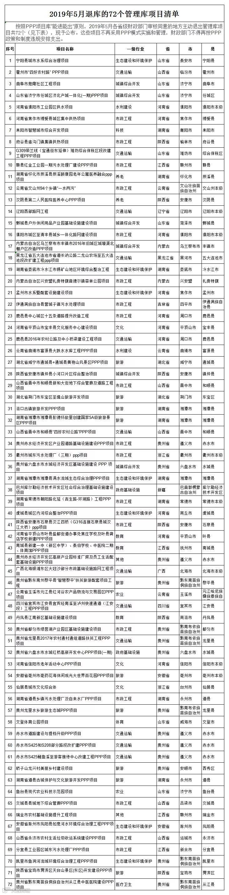 2019年5月各省级财政部门审核同意的地方主动退出管理库项目共72个(见下表),现予公布。这些项目不再采用PPP模式实施和管理,财政部门不得再按PPP政策和制度违规安排支出。