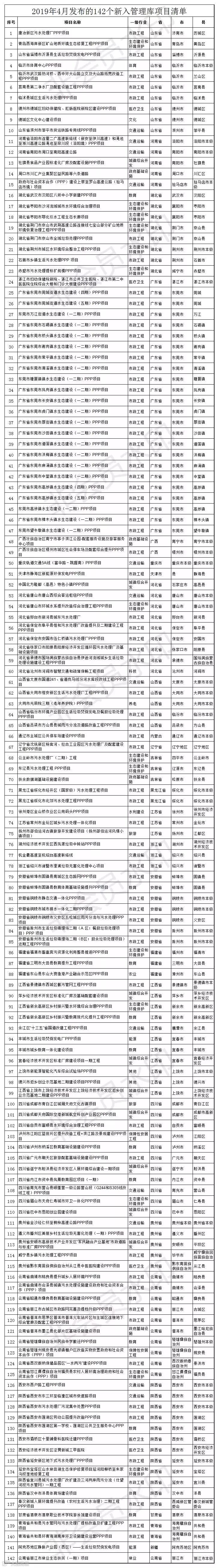 十二、 2019年4月发布的142个新入PPP管理库项目清单
