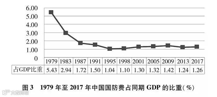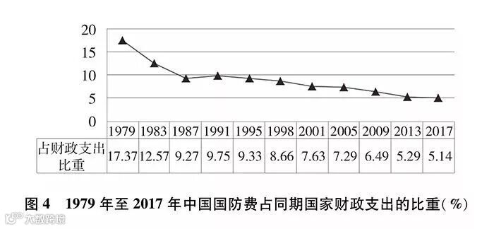 改革开放以来,中国国防开支经历了从维持性投入到适度增长的发展历程,总体保持与国家经济和财政支出同步适度协调增长。国防费占国内生产总值(GDP)比重从1979年最高的5.43%下降到2017年的1.26%,近30年一直保持在2%以内。1979年国防费占国家财政支出比重为17.37%,2017年为5.14%,下降超过12个百分点,总体下降趋势明显。