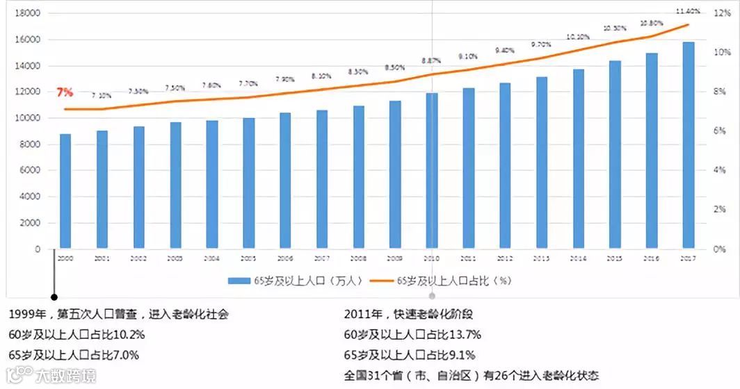 图1 2000-2017年中国65岁以上老年人口及占比