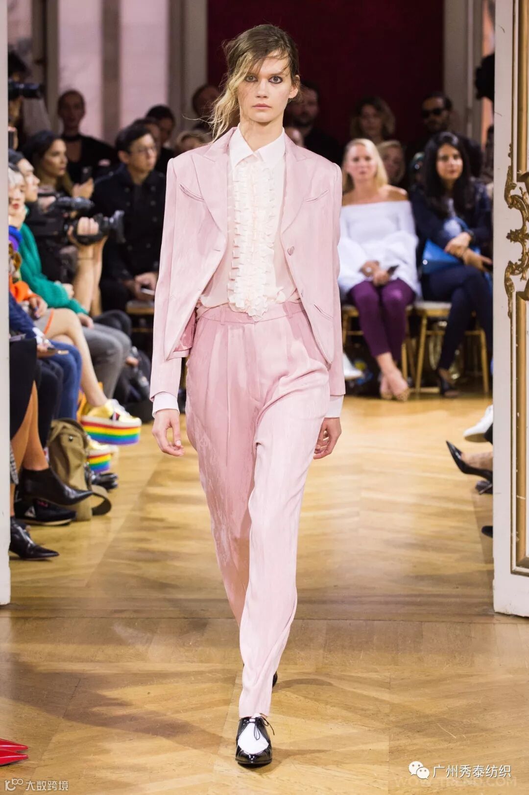 粉色的回归依旧让人欣喜不已,粉嫩而不油腻,与套装的结合,实现当下流行多元化组合的趋势。