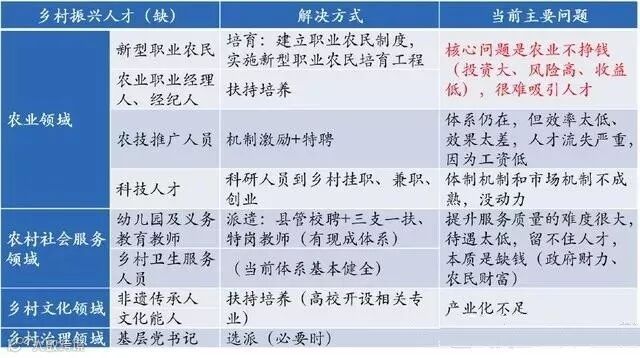 1.农技推广人才、教师、乡村卫生服务人员,这三方面目前国家是有比较完整的体系的,当前主要问题是薪资水平较低、人才流失严重,说到底还是钱的问题。