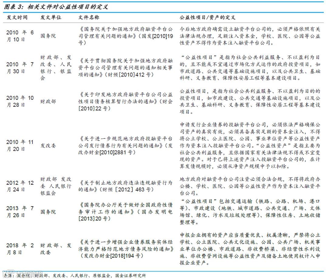 除此以外还陆续有文件提及“公益性资产”概念,2881号文中认定“公益性资产”是指主要为社会公共利益服务,且依据国家有关法律法规不得或不宜变现的资产。大部分文件提及到的“公益性资产”包括公立学校、公立医院、公园、事业单位资产等。