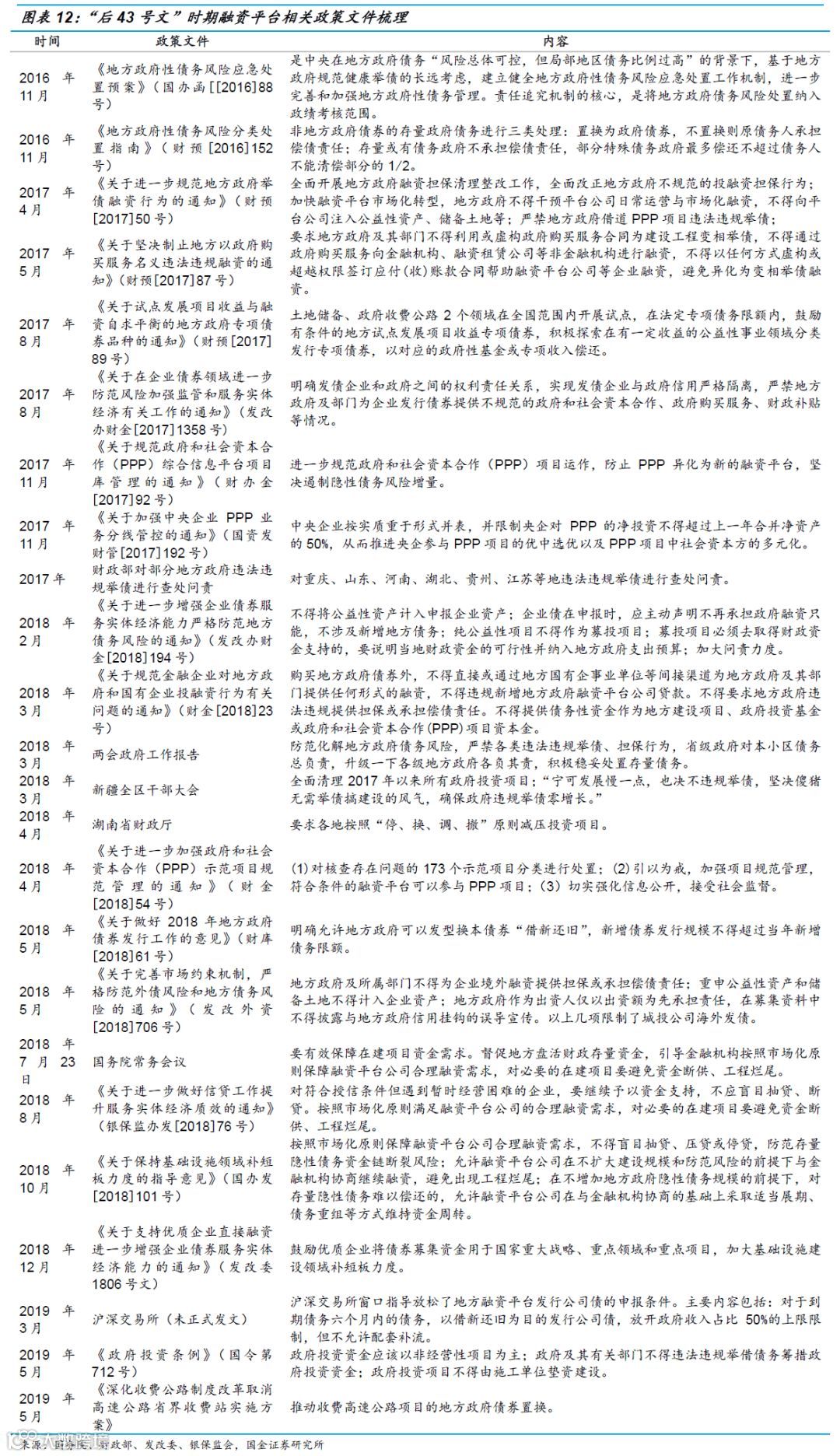 2008年以来,融资平台的政策可以大致分为四个阶段,即2008年-2009年、2010年-2014年9月、2014年9月-2016年11月、2016年11月至今。其中第一阶段城投平台受政策鼓励,快速增长;第二阶段俗称“19号文”时期,对平台的监管主要是以信贷为抓手,控“量”为主;第三阶段俗称“43号文”时期,以“开正门、堵偏门”为主线,赋予地方政府举债权,但实际执行力度不强;第四阶段为“后43号文”时期,注重疏堵结合,执行性强。2019年5月5号《政府投资条例》出台,从政府投资端限制地方政府举债,但是5月21日国务院办公厅发文,推动收费高速公路项目的地方政府债券置换,为以收费公路为主要业务的平台公司带来一波利好,“723”以来的城投监管放松与城投债市火爆是否可持续?我们认为仍需看后续配套措施。