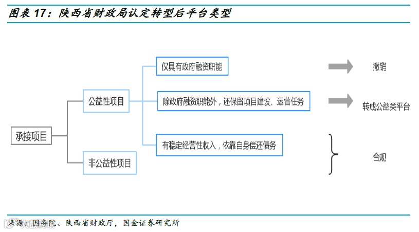 当然根据陕西省财政厅印发的《关于推进我省融资平台公司转型发展的意见》,兼优政府融资和公益性项目建设、运营职能的平台公司在剥离政府融资职能后,也可以转型为公益性国企,承接政府委托的基建、公用事业、土地开发等公益性项目。
