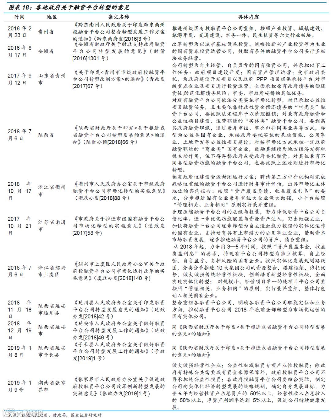 目前,陕西省、山东省、江苏省、浙江省都分别出台了平台转型的意见,我们从中选取了2个最具有代表性的文件来说明政府角度应如何实现平台公司转型。具体各地的转型相关文件见图表18。