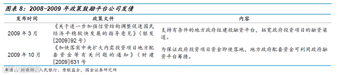 2008年9月国际金融危机开始,为缓解国内经济下行压力,11月中央国务院出台“4万亿元经济刺激计划”,但中央财政仅提供1.1亿元资金支持,为解决地方政府配套资金融资困难,2009年3月人民银行联合银监会发布92号文支持有条件的地方政府组建融资平台拓宽融资渠道,财政部同年10月发布《关于加快落实中央扩大内需投资项目地方配套资金等有关问题的通知》(财建[2009]631号),表示地方政府配套资金可利用政府融资平台通过市场机制筹措,融资平台借此机会快速发展。