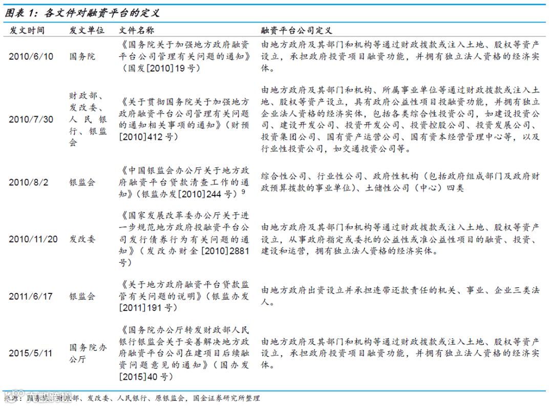随后,2010年7月30日,财政部、国家发改委、人民银行、银监会四部委联合下发了《关于贯彻<国务院关于加强地方政府融资平台公司管理有关问题的通知>相关事项的通知》(财预[2010]412号)[5](下文简称“412号文”),文件中进一步明确了融资平台公司为:由地方政府及其部门和机构、所属事业单位等通过财政拨款或注入土地、股权等资产设立,具有政府公益性项目投融资功能,并拥有独立企业法人资格的经济实体,包括各类综合性投资公司以及行业性投资公司。412号文对地方政府融资平台的定义与19号文基本一致,但412号文对19号文定义中的“政府投资项目”加上了“公益性”,使得融资平台承担的项目更加明确,并通过列举进一步明确了融资平台的范围。