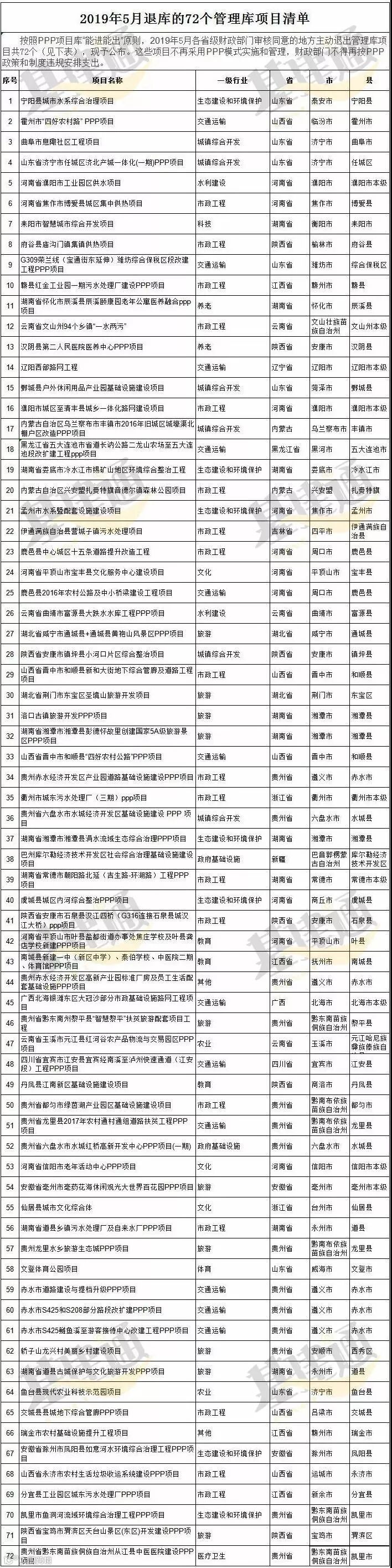 财政部PPP中心官网6月28日消息,按照PPP项目库“能进能出”原则,2019年5月份有72个项目退出了PPP项目管理库。而据基建共享的统计,自2019年1月至5月,已经累计有180个项目经各省级财政部门审核同意后主动退出管理库,其中1-2月份44个、4月份64个、5月份72个(3月份尚未见公布退库清单)。这些项目不再采用PPP模式实施和管理,财政部门不得再按PPP政策和制度违规安排支出。具体的退库项目清单如下: