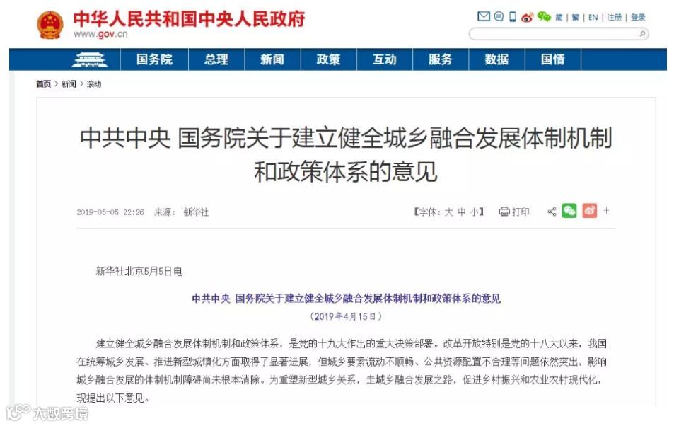 城乡融合发展体制机制和政策体系的意见》中