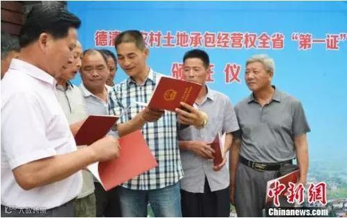 资料图:村民代表领到了新的农村土地承包经营权证 王力中提供