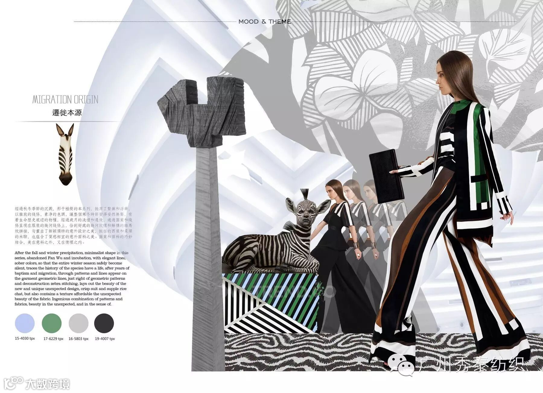 经过秋冬季节的沉寂,形于极简的本系列,抛弃了繁杂和浮华,以雅致的线条,素净的色调,让整个春夏清新淡雅。有着生命历史痕迹的物种,经过岁月的洗礼和迁徙,通过图案和线条呈现在服装的几何线条上,恰到好处的几何纹样和结构的斑马纹拼接,勾画出新颖独特的意外设计之美。图案和面料的巧妙结合,美在意料之中,又在情理之中。