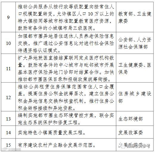 (十五)促进优质公共服务资源共享。鼓励都市圈内开展多层次多模式合作办学办医,支持有条件的中小学和三级医院推进集团化办学办医,开展远程教学医疗和教师、医护人员异地交流,支持中心城市三级医院异地设置分支机构。在都市圈内率先实现与产业链相配套的中高职学校紧缺专业贯通招生。推动病历跨地区、跨机构互通共享,推动医学检验检查结果跨地区、跨机构互认。推动公共服务从按行政等级配置向按常住人口规模配置转变。允许镇区人口10万以上的特大镇按同等城市标准配置教育医疗资源,鼓励有条件的小城镇布局三级医院,降低与大中城市公共服务落差。增加健康、养老、家政等服务多元化供给,鼓励都市圈城市联建共建养老机构,加快城市设施适老化和无障碍改造。推动博物馆、剧院、体育场馆等共建共享。