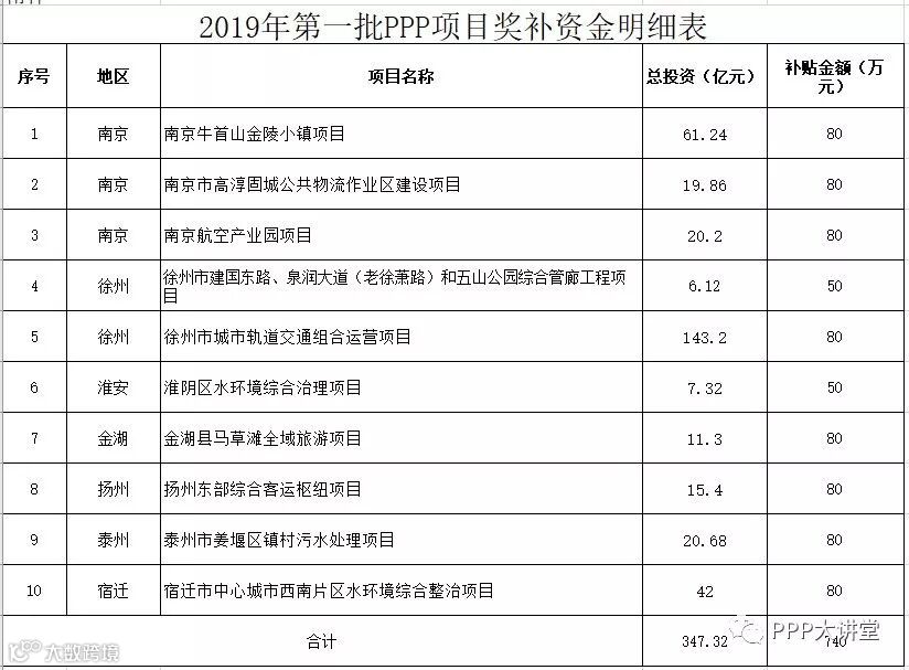 据悉,江苏省2019年第一批PPP项目奖补资金分别下达给南京市、徐州市、淮安市、金湖县、扬州市、泰州市、宿迁市财政局,获得奖补的项目名单如下: