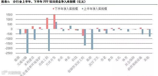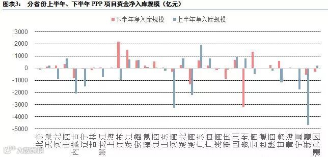 分省份来看,上半年新疆、宁夏、内蒙古等西部欠发达省份资金退库规模较大,而贵州、广东、四川等西南省份仍有较大规模资金入库。大部分省份下半年PPP项目资金净入库规模态势转好,甘肃、云南、江苏等省份由负转正,表明上半年项目清理已基本完成,而贵州、重庆等西南省份退库资金规模反而增加,表明这些省份尚在清理库存项目,其清理阶段滞后于其他省份。