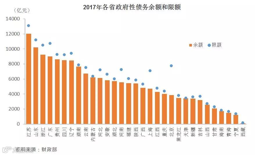 2017年地方政府债务余额为16.5万亿元,而中央政府给的2018年地方债限额近21万亿元,这两者的差额比新增地方债额度高出2.3万亿元。对于北京、上海、浙江、广东等相对发达的地区来说,现有债务余额与债务限额相比尚有不少余量,但其本身对债务额度的需求其实并不高。特别是北京,2017年的债务限额和其实际的债务余额之间尚有高达4000亿元的债务空间,而其自身财力较强,如此高的债务空间和相对较弱的地区形成鲜明对比。