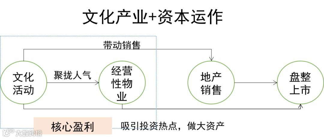 文化产业+资本运作:旅游和商业等经营性物业作为核心盈利渠道,地产销售类物业为辅。通过举办文化活动如戏剧节、皮影戏等,吸引爱好者以及游客,带动区域人气,从而成为投资热点,以盘整做大资产上市。