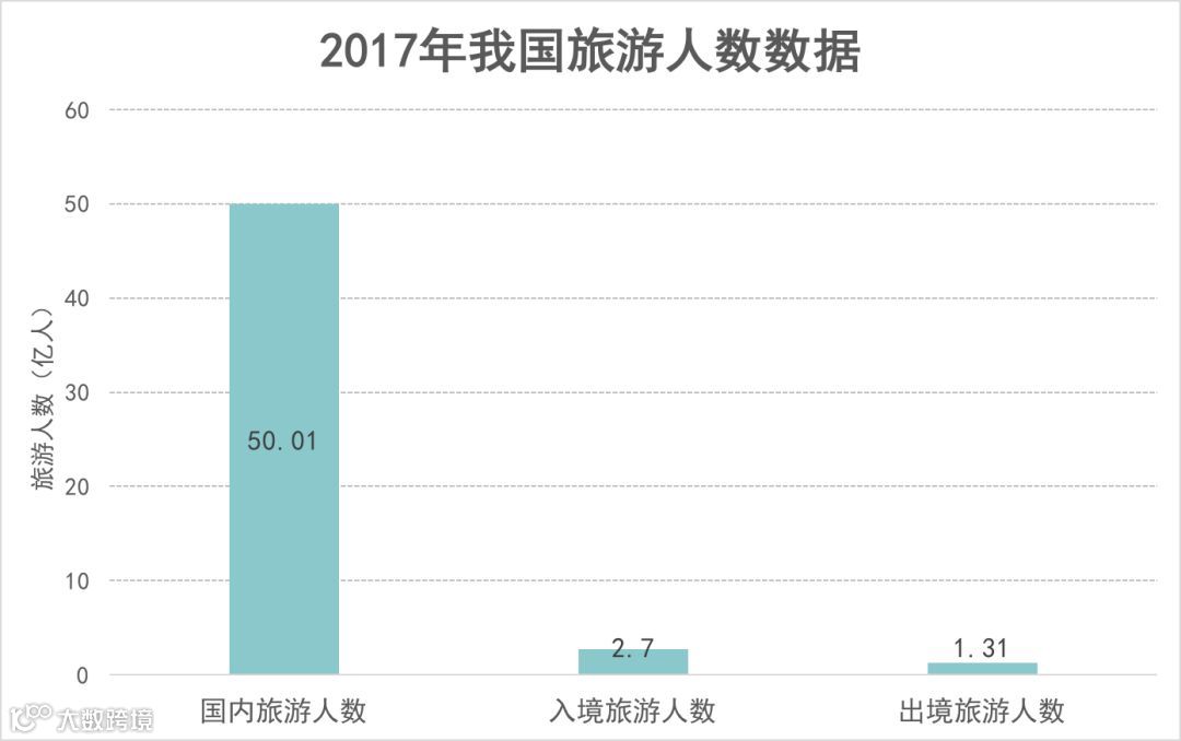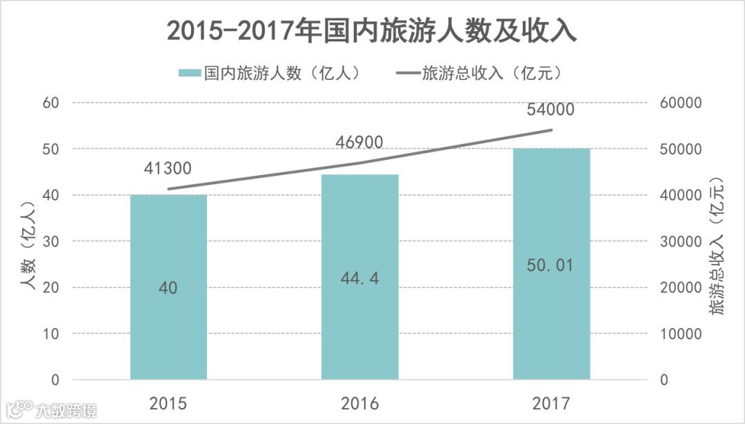 近年来,我国旅游市场发展迅猛。2015年-2017年国内旅游人次稳步上升,由2015年的40亿人次增长至2017年的50.01亿人次,2017年实现旅游总收入5.40万亿元,增长15.1%。初步测算,2017年全国旅游业对GDP的综合贡献为9.13万亿元,占GDP总量的11.04%。可见,国内旅游市场规模不断扩大,其带来的利润空间十分可观。
