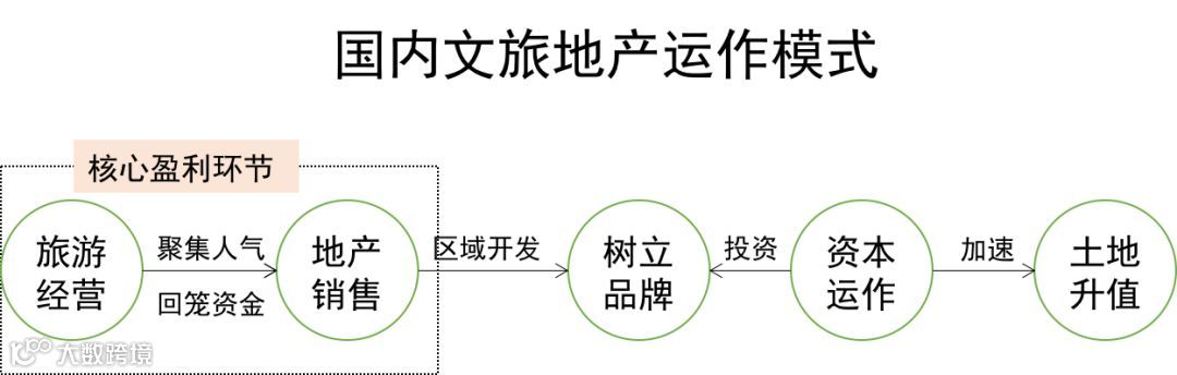 国内文旅地产的盈利来源可归纳为两大板块:一是地产销售;二是旅游经营。地产销售是依附在旅游经营上面的,旅游经营聚拢人气、带动地产销售,卖房可以快速回笼资金,然后再投入到文旅项目的开发中。地产业务的利润率高,就华侨城而言,地产业务每年为其贡献约80%的利润。但间接的价值创造核心还是旅游业务,优秀的文旅项目都具有鲜明的文化特色、独有的产业、服务等,能够很好地带动配套住宅的销售。