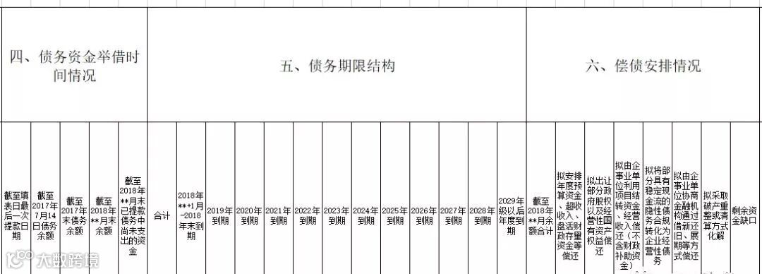 六是,偿债安排情况:包括截至2018年**月余额合计;拟安排年度预算资金、超收收入、盘活财政存量资金等偿还;拟出让部分政府股权以及经营性国有资产权益偿还;拟由企事业单位利用项目结转资金、经营收入偿还(不含财政补助资金);拟将部分具有稳定现金流的隐性债务合规转化为企业经营性债务;拟由企事业单位协商金融机构通过借新还旧、展期等方式偿还;拟采取破产重整或清算方式化解;剩余资金缺口。